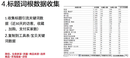 之前组建的还有另外一个表,热门修饰词,把热门修饰词复制到工具箱里面的热词词根表,只需复制词,不需要数据。当把词跟复制完成后,对应的搜索人气和点击人气就会自动匹配出来,这是根据500热搜词而来。接下来是一个优化的步骤,根据点击人气做一个降序排列,删除重复词根,再删除与自己产品不相关的词,属性不相干、风格不相关等等;最小词根的拆除词也要去掉,例如保鲜盒拆出的“保”“鲜”,“保鲜”本身是一个属性词,把保鲜二字再进行拆分就没有太大意义,我们要保证最小单位的词根。