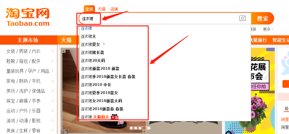 打开淘宝网---在搜索栏里搜索你的产品的关键词。就比如连衣裙